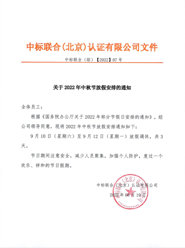 2022中秋節放假通知